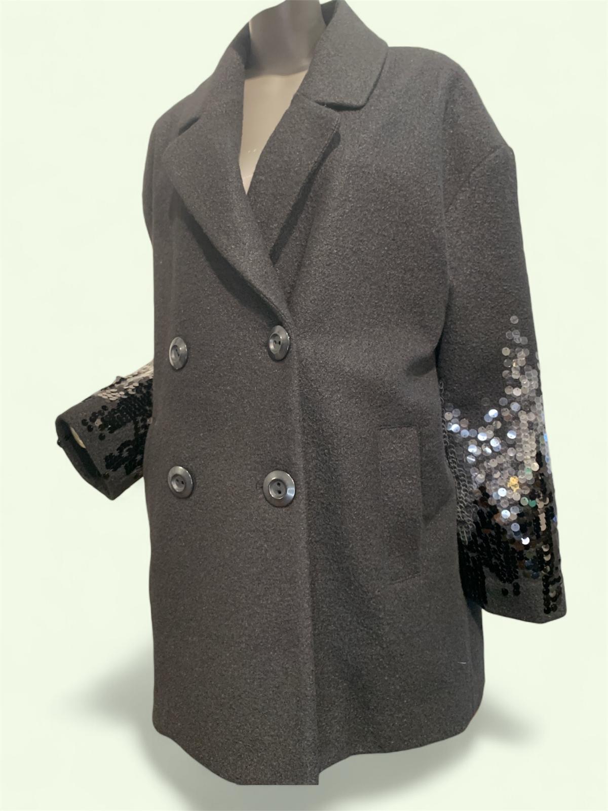 Dieser elegante Damenmantel von GAUDI besticht durch seinen geraden Schnitt und das moderne Design. Der Zweireiher mit großen Knöpfen unterstreicht die zeitlose Eleganz, während funkelnde Pailletten an den Ärmelabschlüssen für ein raffiniertes Highlight sorgen. Ein perfekter Begleiter für stilbewusste Frauen, die klassisches Design mit einem Hauch Glamour lieben.