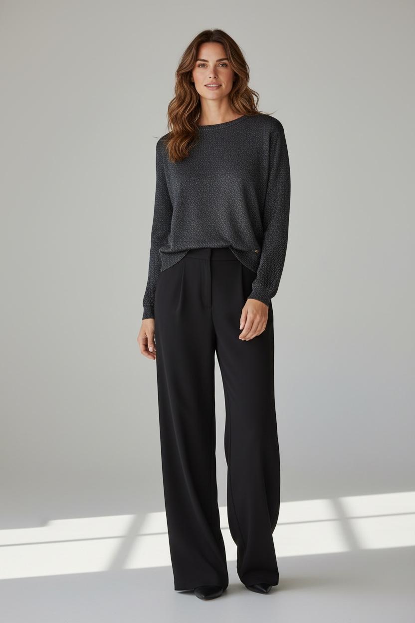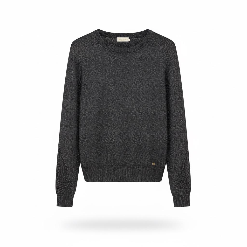 Dieser elegante Damenpullover von GAUDI Jeans besticht durch sein modernes und zeitloses Design in Schwarz mit dezent schimmerndem Silber-Lurex. Das angenehm zu tragende, gestrickte Material aus Polyester, Viskose und Polyamid sorgt für Komfort, während das attraktive Lochmuster an Ärmeln und Rücken raffinierte Akzente setzt. Ein vielseitiges Kleidungsstück, das sowohl im Büro als auch in der Freizeit stilvoll überzeugt.