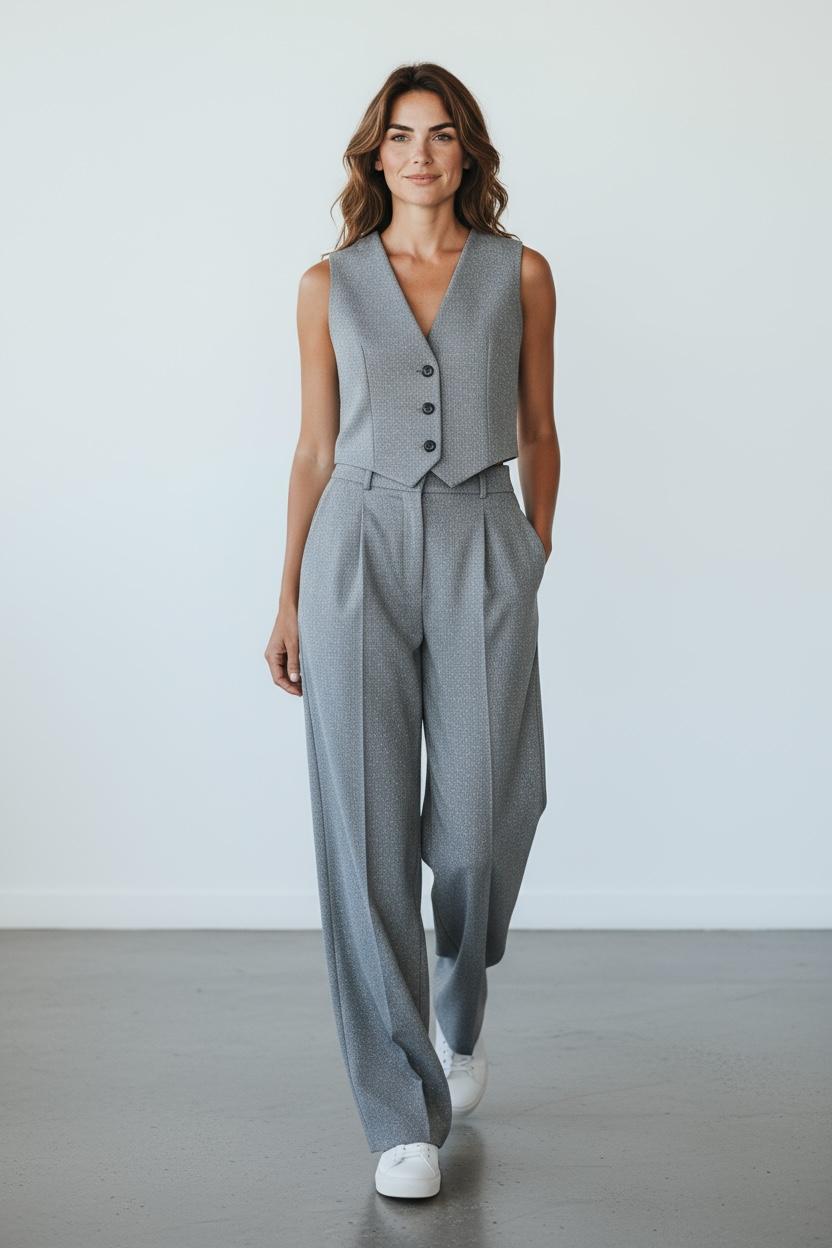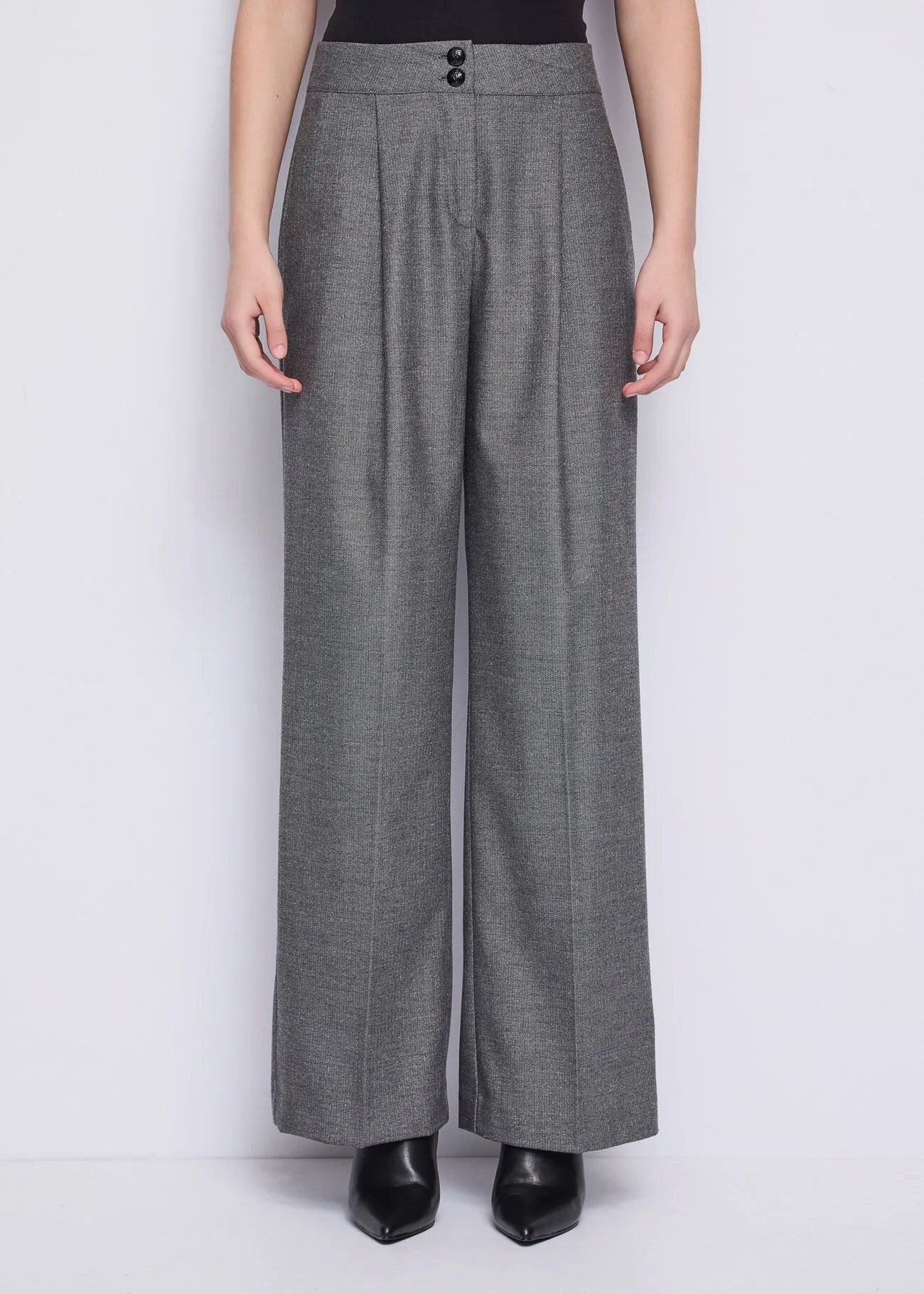 Elegante Damenhose von GAUDI Milano mit modernem Design und höchstem Tragekomfort. Das dezente Fischärmster in Grau wird durch feine Lurex-Fäden veredelt und verleiht der Hose einen subtilen Glanz. Klassische Bundfalten und zwei große Knöpfe vorne unterstreichen den zeitlosen, raffinierten Look. Perfekt für anspruchsvolle Styling-Kombinationen im Alltag und bei besonderen Anlässen. Italienische Größenangabe.