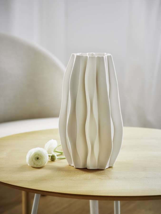 Diese Vase verbindet innovative 3D-Druck-Technologie mit der natürlichen Eleganz organischer Formen. Nach dem Druck wird sie bei 1.200 °C gebrannt, wodurch die filigrane Schichtstruktur bewahrt bleibt und einen faszinierenden Kontrast zum fließenden Plissee-Effekt schafft. Um ihre feine Oberfläche zu schützen, empfiehlt sich eine schonende Handreinigung mit einem weichen, feuchten Tuch, sodass sie ihren besonderen Charme langfristig behält.